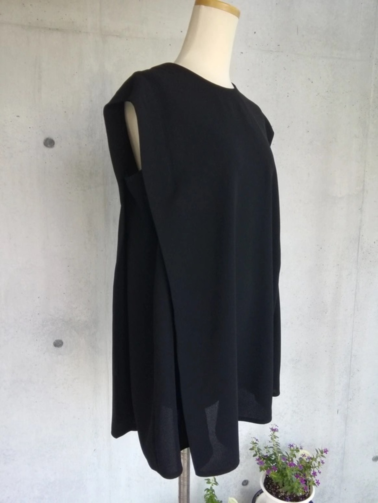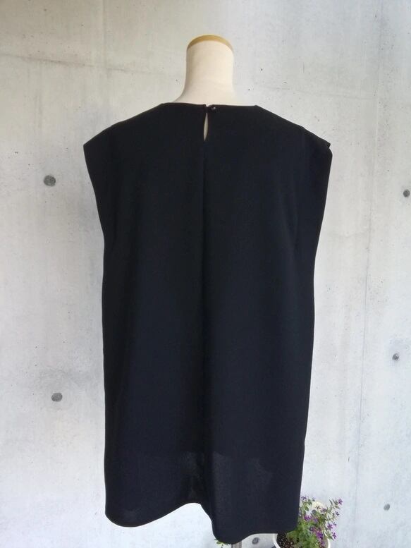 気になる個所をカバーできる大人のノースリーブチュニックブラウスが出来上がりました。ベースはオールシーズン用の透け感の無いブラックフォーマル用の生地を使用しました。