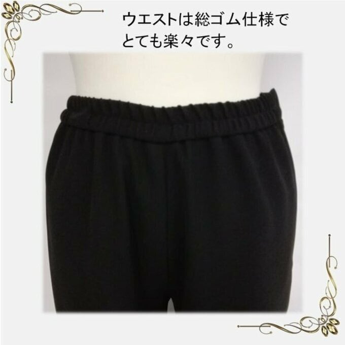 楽なのに綺麗なストレートパンツ: ウエストは総ゴム仕様で、長時間の参列でも締め付け感がありません。膝から下をすっきりと見せるストレートラインにこだわりました。