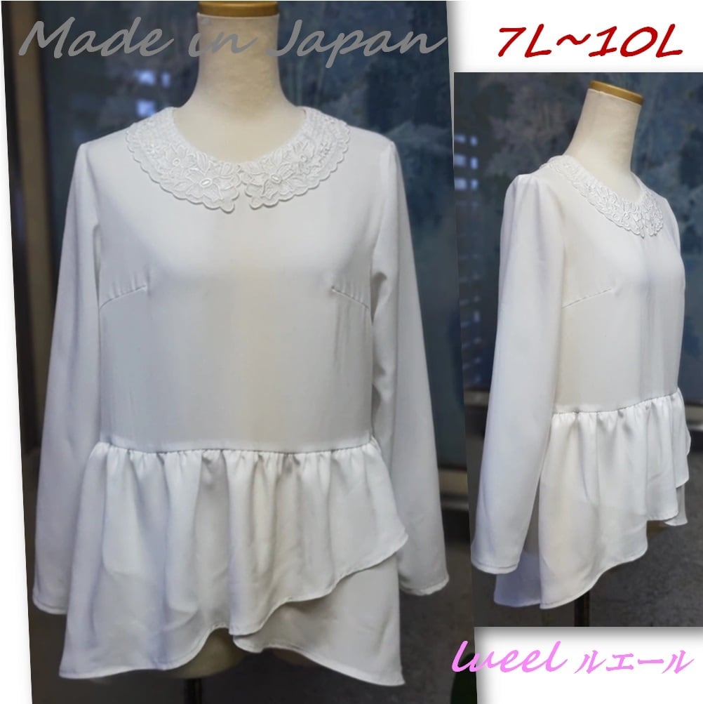 フォーマルシーンから普段使いまで!日本製レース襟の美シルエット白ペプラムブラウス 【Lueel(ルエール), 7L~10L, 品番:137302】