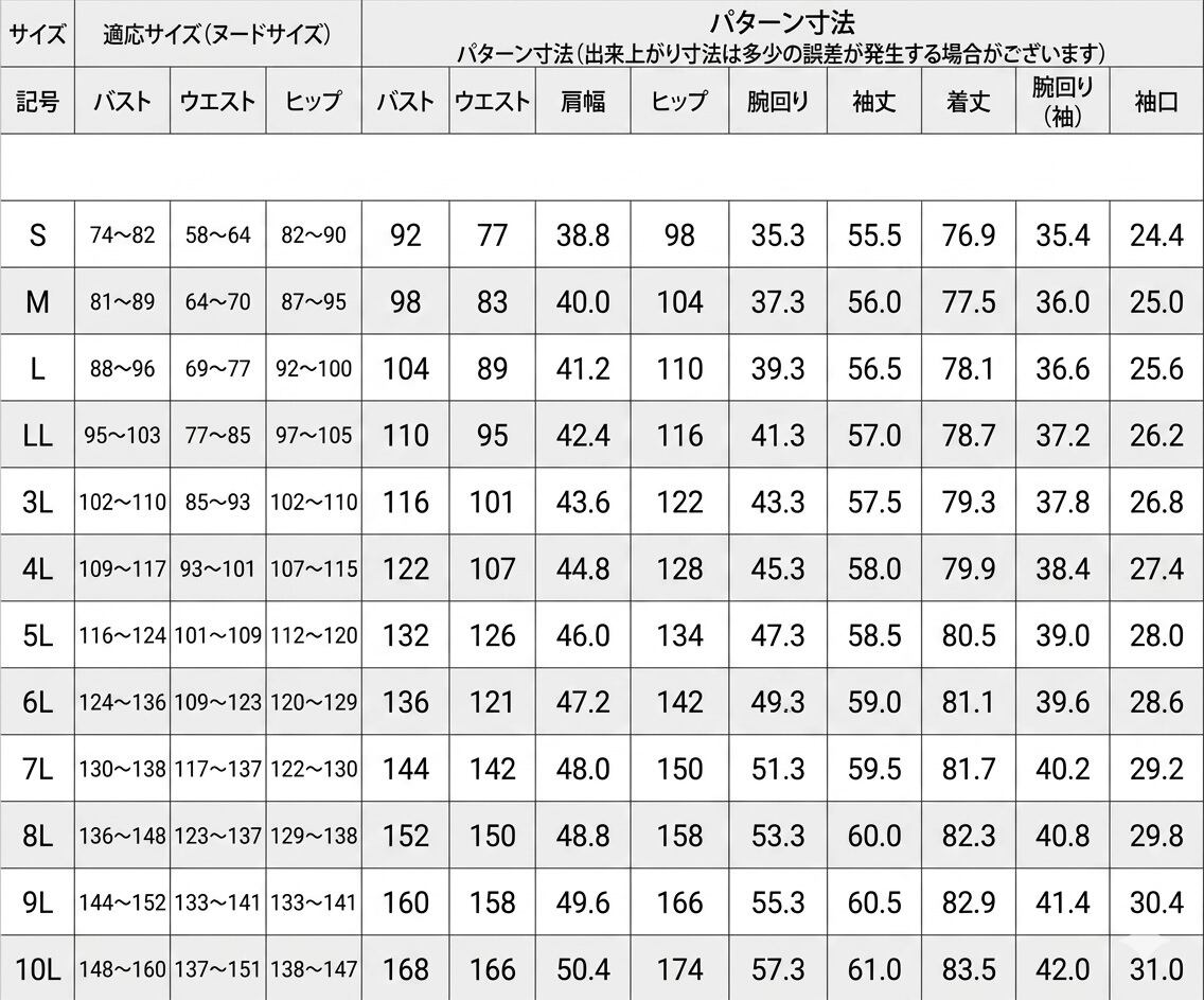 どんな体型の方にもジャストサイズで着ていただきたいという想いから、Sサイズから最大10Lサイズまで幅広くご用意いたしました。