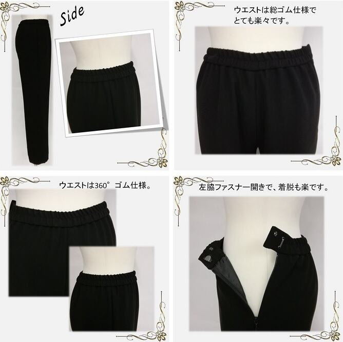 パンツは特に、ヒップ、お尻がゆとりがないものが多い。袖だけぴちぴち。脇ゴム、後ゴムはよくあるけど、座っていて苦しいのはお腹。大きいサイズはミセスよりの商品が多く余計に太って見えるなど、いろいろな悩みがあると思います。そんな悩みを少しでも解消できるよう、デザインは若く、着心地はよく、少しでも痩せて見えるパターンのこだわり。長時間着ても楽で、窮屈感のない、デティールのこだわりを大切にしたブラックフォーマルです。